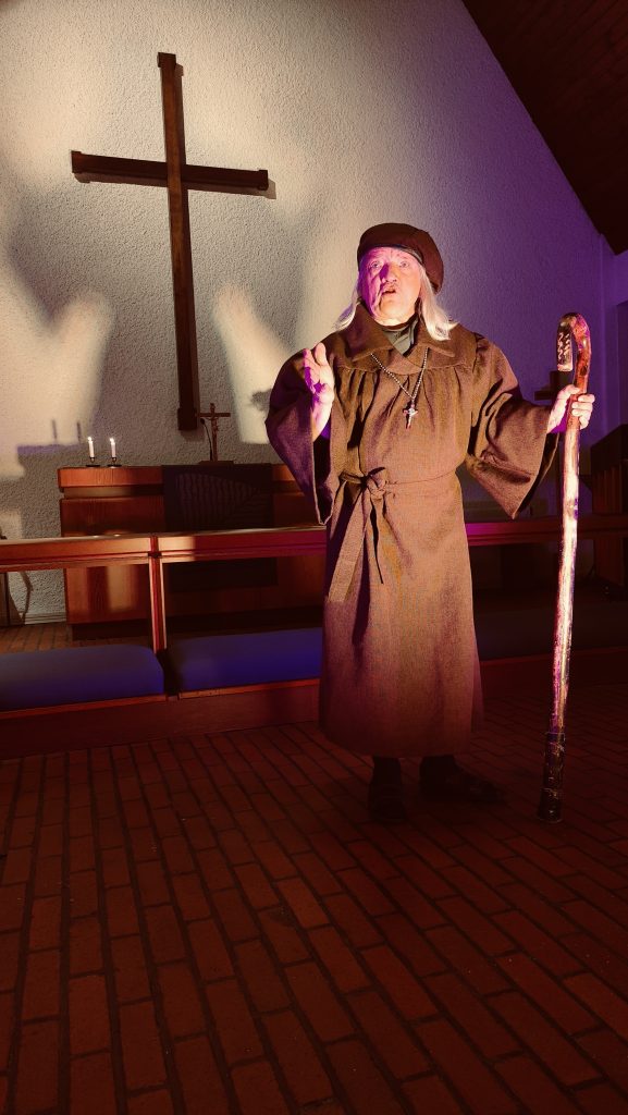 Miestenillassa hän esitti Luther-monologin. Näin teatterin keinoin pääsimme mukaan uskonpuhdistajamme elämään ja mielenmaisemiin.