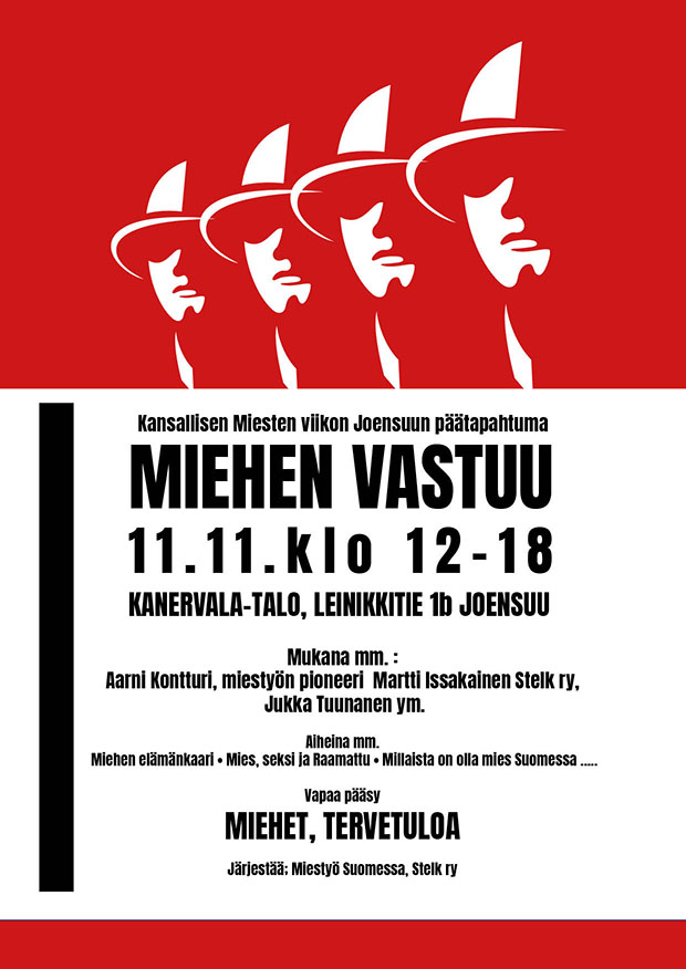 Kansallisen Miesten viikon Joensuun päätapahtuma MIEHEN VASTUU 11.11.klo 12-18 Kanervala-talo, Leinikkitie 1b Joensuu Mukana mm. : Aarni Kontturi, miestyön pioneeri Martti Issakainen Stelk ry, Jukka Tuunanen ym. Aiheina mm. Miehen […]